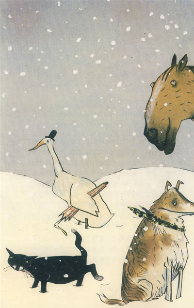 哈德立安是一匹高头大马,他专门负责耕地,与看家狗海克托相反,他可喜欢下雪啦,这是因为,第一,他的蹄子踩在雪地上,觉得十分软和;第二,下大雪时,他要干的活儿很少很少,这使他感到特别的轻松愉快。他对公牛阿尔贝特说: “对我来说,这雪一直下,下到下个星期三都可以。”