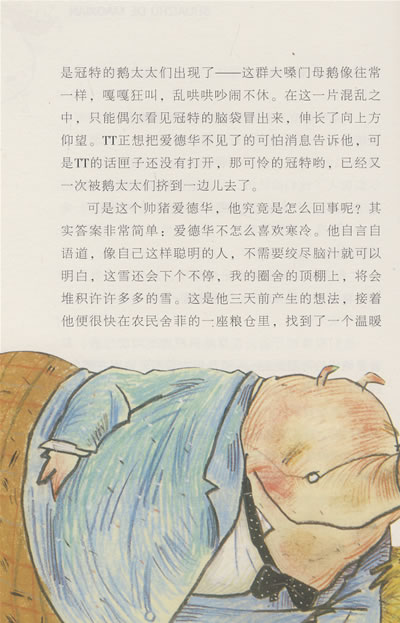 但是爱德华却调转身子,一步一颠缓慢地走回自己的粮仓,他只能任随这一群动物在雪地里冻得鼻子通红,浑身瑟瑟颤抖啦。他只想蜷伏在温暖的草堆上,别无他求。按他的想法,即使在粮仓里待到下一个夏季,他也是不会厌烦的。说不定,今后大家会逐渐地给予他应有的重视——而且再也不会卑鄙地对他不闻不问,让他冻个半死了吧。说不定到那时,他又觉得温暖了吧。