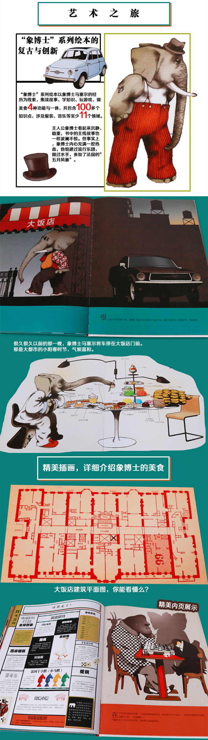 “象博士”系列绘本以象博士马塞尔的经历为线索,集读故事、学知识、玩游戏、做美食4种功能于一体,其中《象博士的人文课》包含100多个知识点,《象博士的艺术课》包含80多个知识点,这些知识涉及服装、音乐等至少11个领域。这套书内容丰富,从故事、知识到插画风格都具有复古气息,图书形式又别具一格,可以带给读者多重阅读体验。