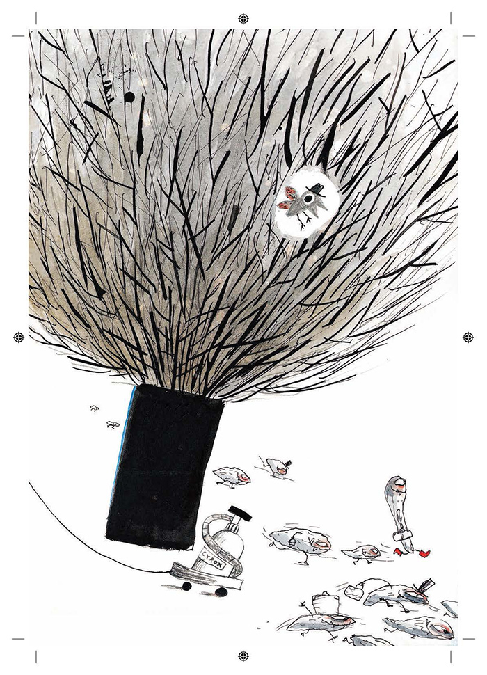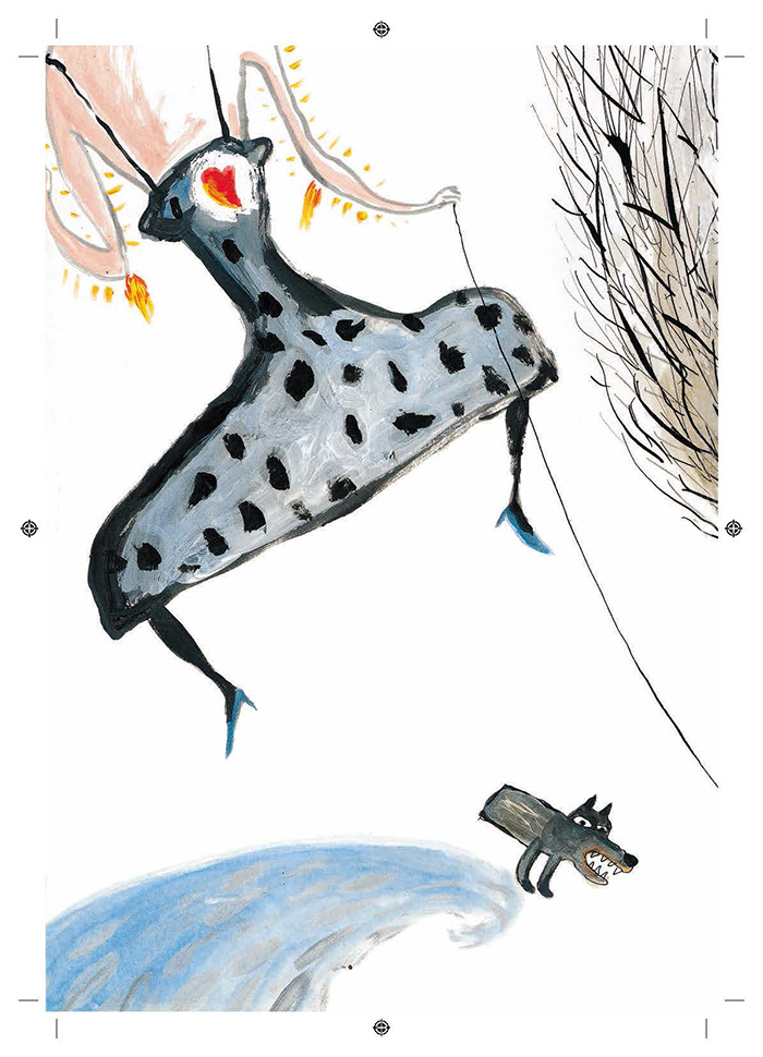 插画家的画风自由洒脱,充满童趣。擅长运用多种材料和不同技法。普通的铅笔、纸板、胶水都成了画面中的组成要素。对于物像的边缘和轮廓增强化处理,非常符合阅读这本书的小读者的视觉发育规律。画家在混合技法的运用上极有特色,画面肌理的制作精致用心,在大面积的色块上使用衬色、飞白、多材质堆叠的技法,呈现出富含趣味的丰富细节变化,画面充满设计感,将有趣的图形组合成耐人寻味的“巧合”。