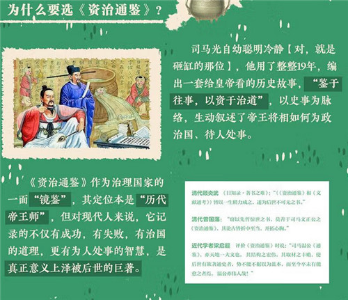 “鉴于往事,以资治道”,以史事为脉络,生动叙述了帝王将相如何为政治国、待人处事。它展示王朝兴衰,评论沧桑交替,揭示其中蕴含的历史规律,是一部专门写给帝王,更是一部写给后人的以“网罗宏富,体大思精”的史书,堪称“修身治国平天下”的指南。   《资治通鉴》作为治理国家的一面“镜鉴”,其定位本是“历代帝王师”,但对现代人来说,它记录的不仅有成功,有失败,有治国的道理,更有为人处事的智慧,是真正意义上泽被后世的巨著。打开这套书,能感受到字句皆功夫,处处见匠心。