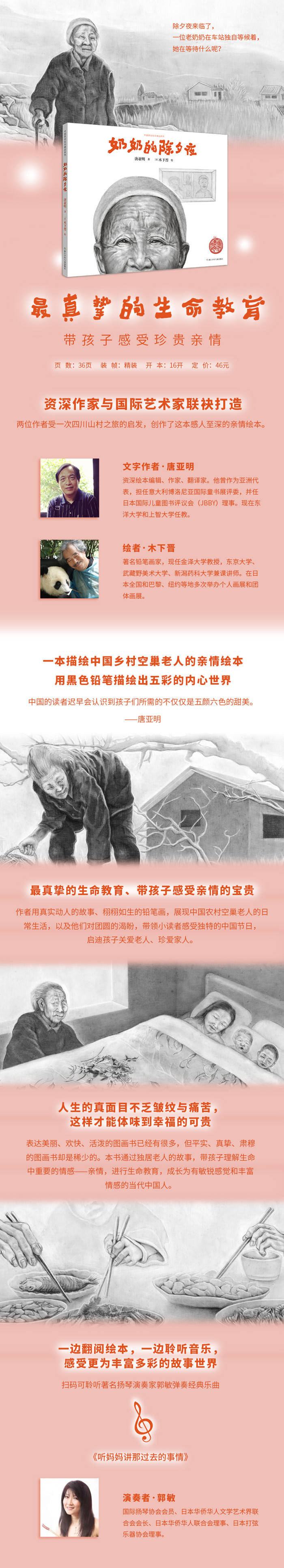 ★亮点一:资深作者联袂打造的中国亲情绘本 唐亚明是资深绘本编辑、作家、翻译家。木下晋是一位具有国际声誉的日本铅笔画艺术家,两位作者受一次四川之旅的启发,创作了这本中国农村题材的亲情绘本。 ★亮点二:一本描写中国农村空巢老人故事的绘本 本书用真实动人的故事、栩栩如生的铅笔画,展现中国农村空巢老人的日常生活,以及他们对团圆的渴盼,带领小读者认识这个社会群体,启迪小读者关爱老人、珍爱家人。 ★亮点三:真挚的生命教育,带孩子感受亲情的宝贵 中国的读者迟早会认识到孩子们所需的不仅仅是五颜六色的甜美。——唐亚明 说美丽、欢快、活泼的图画书已经有很多,但平实、真挚、肃穆的图画书却是稀少的。本书通过独居老人的故事,带孩子理解生命中重要的情感——亲情,进行生命教育,成长为有敏锐感觉和丰富情感的当代中国人。 ★亮点四:附赠音频《听妈妈讲那过去的事情》 扫码聆听著名扬琴演奏家郭敏弹奏经典乐曲《听妈妈讲那过去的事情》,让孩子一边翻阅绘本,一边聆听音乐,感受更为丰富多彩的故事世界。