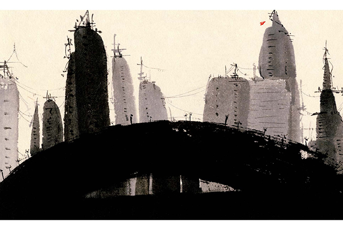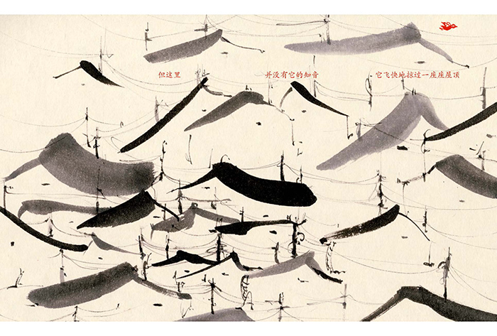 一只有着烈火般鲜艳颜色的鸟儿穿梭在乡村、城市之间,她在寻找一位知音。水墨绘制的田野乡村、高楼林立随着鸟儿的飞翔降落在读者眼前展开,作者运用这一充满东方韵味的技法,通过运笔的灵活变化、墨色的浓淡交错,不仅展现出山林乡野的恬静舒适,也展现出城市扑面而来的压抑,突破了传统的构图方式,在保留韵味的基础上,将点、线、面的碰撞融合运用得淋漓尽致,形态各异的鸟儿则用木刻呈现,带来了不同寻常的视觉体验。