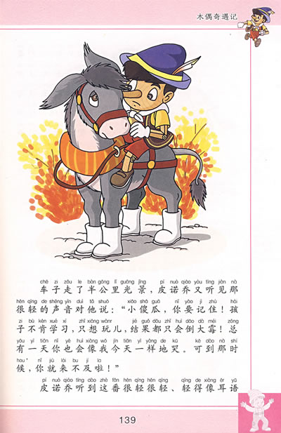 老木匠杰佩托得到了一段神奇的木头,他精心地把它刻成了一个木偶,并起名为皮诺乔。杰佩托非常爱皮诺乔,为了他可以付出自己的一切,但顽皮的皮诺乔却总是让人失望。他淘气、撒谎、不爱读书、好吃懒做,结果经历了一连串的惊险遭遇:被瘸腿狐狸和瞎眼猫的花言巧语骗去了所有的钱,还差点被他们吊死;和贪玩的朋友去了玩儿国,却被变成了一只驴子;掉进海里后,又被一条大鱼吞进了肚子里……幸好有善良的蓝头发仙女始终在帮助他,使他终于改掉了所有的缺点,变成了一个真正的男孩。