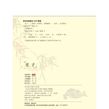《庄子》一书是“美丽国学”中的一种,此书对《庄子》内外篇的经典篇目进行译注,同时阐释出当下的人生道理,给人们提供的不是处理问题的现成答案,不是解决人生困惑的万能灵丹,而是一种认识事物本质的方法,培养的是一种物我合一的宇宙观,收获的是一种自在自为的人生境界,让人们在生活中游刃有余,精神上通达开阔。 译文尽可能符合现代人的阅读习惯,准确通顺,简洁流畅。而书中意境深远的插图,图文相得益彰。本书是一部适合青少年阅读的国学通俗读物。