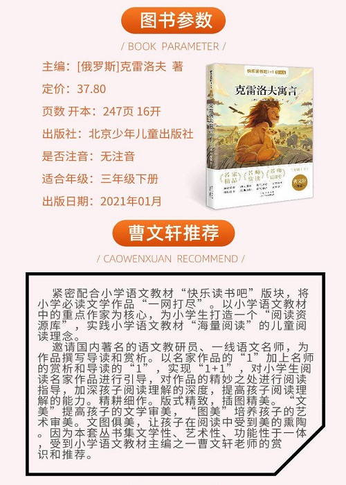 《克雷洛夫寓言》一书,收集了克雷洛夫一生创作的203篇寓言。这些寓言有着极强的人民性和现实性,蕴含着他自己的以及从父辈们那里一代一代传下来的全部生活智慧和实际经验。他的寓言都以诗体写成,语言优美、寓意深刻,常借动物和植物的形象,反映广泛的社会生活,刻画社会上各种人物的复杂性格,抒发自己的民主思想,具有一种特殊的感染力。