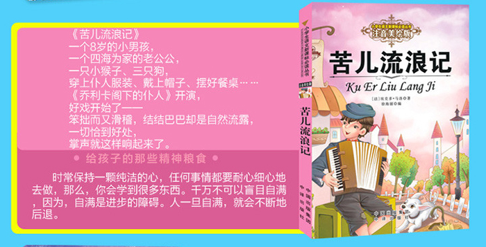 《苦儿流浪记》是一部自传体性质的小说,是“法国青少年爱读的小说之一”。主人公小雷米虽然经历了重重苦难,却始终拥有一颗仁爱之心;他虽是“苦儿”,但凭借善良和心底的爱*终成为“幸运儿”。这是一个充满爱的励志成长故事,小雷米用自己的经历告诉我们:在逆境中坚守感恩、友爱之心,终会看到爱与希望。