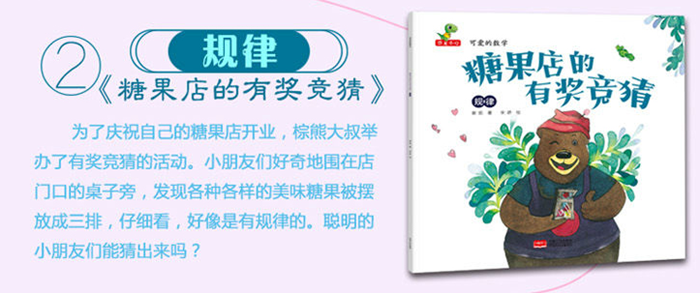 为了庆祝自己的糖果店开业,棕熊大叔举办了有奖竞猜活动。小朋友们好奇地围在店门口的桌子旁,发现各种各样的美味糖果被摆放成三排,仔细看,好象是有规律的。聪明的小朋友们能猜出来吗?