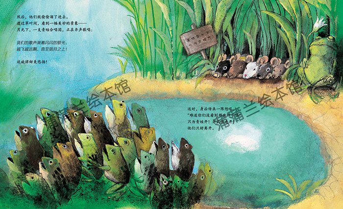满月之夜,五只小老鼠跟随优美的乐声来到城市中的一座公园。在那里,青蛙们正在进行一场音乐会。一个洪亮的声音说:“青蛙音乐会,老鼠快走开。”他们感到失望,但没有垂头丧气。五只小老鼠激励自己成立乐团,制作乐器,举办“小老鼠音乐会”。海报已贴满全城。你收到他们的邀请了吗?