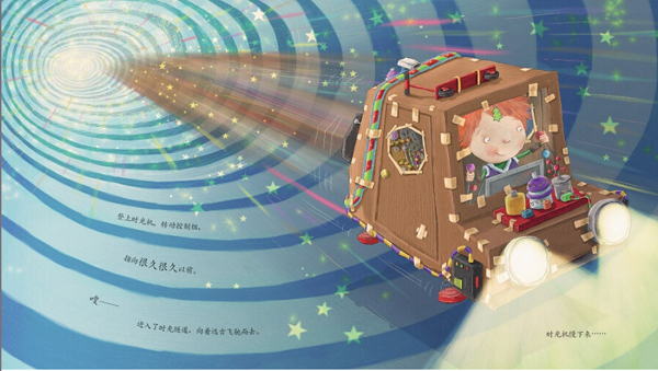 他驾着自制的时间机器,嗖地进入了时光隧道。