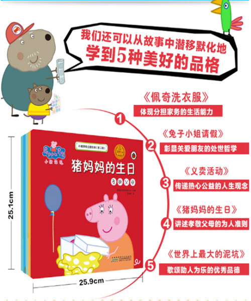 本套书从给妈妈过生日(孝敬父母)、帮妈妈洗衣服(分担家务)照顾生病的小伙伴(关爱朋友)、帮助邻居买东西(助人为乐)、捐款(热心公益)等小朋友熟悉的日常生活入手,通过小猪佩奇与她的家人和好朋友之前幽默温馨的故事,让小朋友潜移默化地养成正确的习惯、良好的习惯和优秀的素养。