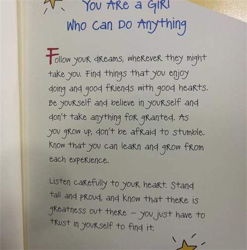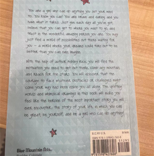 You are a girl who can do anything you set your mind to. You know you can!You are brave and daring, and you have what it takes. Just give each day all you've got, believe that you can get to where you want to go,and tRust in the wonderfvl, amazing person you are. You may just find a world of possibilities out there waiting for you - a world where your dreams could turn out to be belter than you can even imagine. With the help of author Ashley Rice, you will find the motivation you need to getout there, climb any mountain and Reach for the stars. You will discover that the couRage to face whatever obstacles or challenges might come your way has been inside you all along. The uplifting words and whimsical drawings in this book will make you feel like the heroine of the most important story you will ever encounter: the story of your life, in which you can be great, be yourself,and be a girl who can do anything!