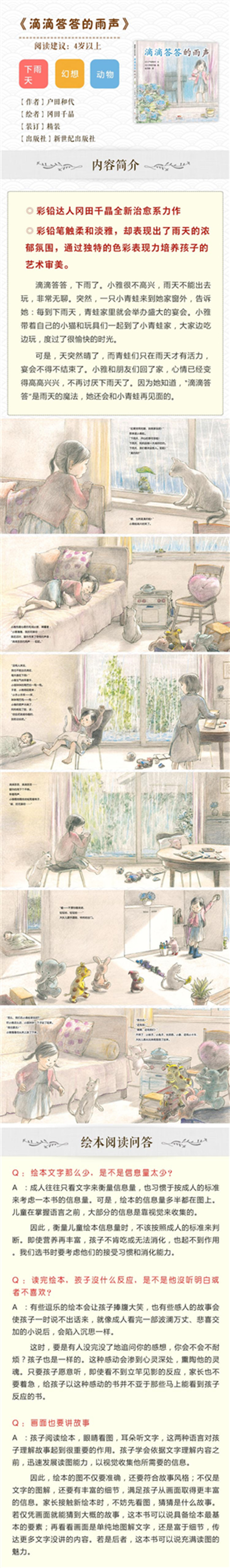 滴滴答答,下雨了。小雅很不高兴,雨天不能出去玩,非常无聊。突然,一只小青蛙来到她家窗外,告诉她:每到下雨天,青蛙家里就会举办盛大的宴会。小雅带着自己的小猫和玩具们一起到了小青蛙家,大家边吃边玩,度过了很愉快的时光。可是,天突然晴了,而青蛙们只在雨天才有活力,宴会不得不结束了。小雅和朋友们回了家,心情已经变得高高兴兴,不再讨厌下雨天了。因为她知道,“滴滴答答”是雨天的魔法,她还会和小青蛙再见面的。 这是一个发生在雨天的、温馨优雅的、充满幻想色彩的故事。彩铅达人冈田千晶用细腻的笔触、淡雅的色彩,让孩子们体会雨天的独特魅力,并有助于教会他们调节心情,对各种外界变故泰然处之。女主人公和小青蛙的友情,在故事结束后依然回味深长,令人意犹未尽。