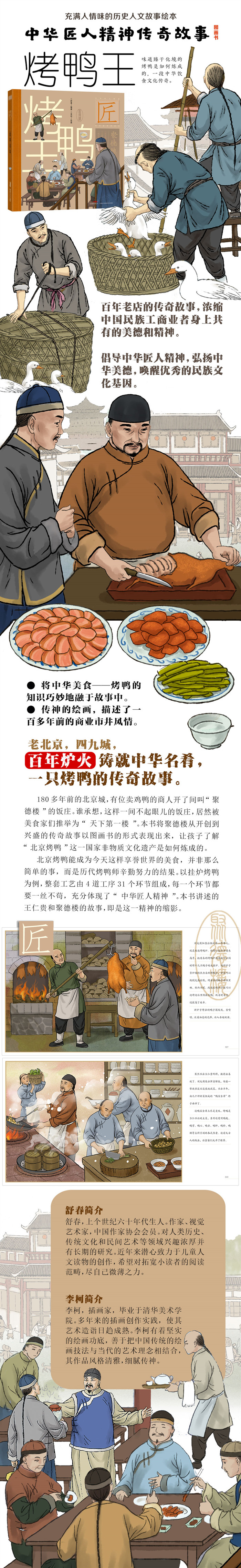 1百年老店的传奇故事,浓缩中国民族工商业者身上共有的美德和精神,通过文字和画面传递给读者。 2将中华美食——烤鸭的知识巧妙地融于故事中。 3 传神的绘画,描述了一百多年前的商业市井风情。 4 扉页采用老前门场景,今昔对比,暗示怀旧与传承。 5 倡导中华匠人精神,弘扬中华美德,唤醒优秀的民族文化基因。