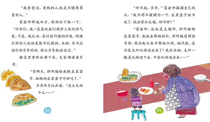 此外,程玮娴熟精妙地把握住了低年级学生的心理感觉,想儿童所想,发儿童所问,一派天真跃然纸上,不动声色地为小说增添了一层幽默的喜剧色彩,读来令人愉悦。
