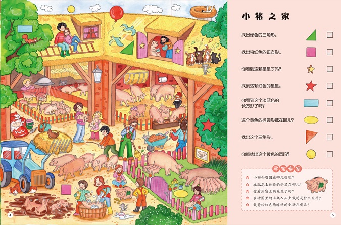 为了鼓励孩子发现线索,游戏类大画册设计了“普通任务题”和 “寻宝专家”栏目。每完成一项普通难度的任务,孩子便可勾选、标记,帮助他们培养做事情的条理性并获得成就感;“寻宝专家”通过问题提示,引导孩子通过观察、分析来寻找答案,具有鲜明的益智游戏特征,在潜移默化中培养他们的逻辑思维能力、观察力和专注力。