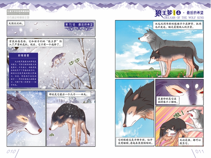 母狼紫岚开始了独自抚养四只狼崽的生活,狼崽们茁壮成长着。小狼黑仔被紫岚指定为培养成狼王的对象,所以紫岚总是先给黑仔喂奶,黑仔吃饱后才能轮到剩下的小狼。在这种刻意培养之下,黑仔的胆量与日俱增,直到竟独自跑出了狼洞,而紫岚竟默许了这种冒险的举动。灾难随之降临,一只凶猛的*叼走了黑仔,紫岚悲伤极了……但狼王梦没有熄灭,轮到小狼蓝魂儿去实现黑桑的遗愿了。冬季降临,紫岚一家回归狼群。蓝魂儿遇到了劲敌黄犊,黄犊多次夺走蓝魂儿的食物,直到蓝魂儿忍无可忍,与黄犊展开了决战,*终蓝魂儿惨胜,却感受到了胜利者的荣耀。紫岚为了培养蓝魂儿,狠下心来拒绝了大公狼卡鲁鲁的情谊。蓝魂儿尾追一头牛犊却因受挫而中途放弃,这一举动惹怒了母亲紫岚,紫岚痛打了蓝魂儿,蓝魂儿委屈极了……漫画改编在遵从原著小说基本故事脉络和精神内涵的前提下,融入了漫画所需要的要素,同时对原著中适合用漫画呈现出来的段落进行了改造,丰富了漫画版的故事性和趣味性。