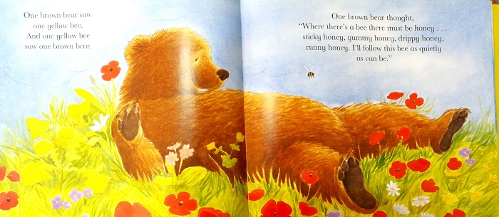 Where There's a Bear, There's Trouble!棕色的熊看见一只黄色的蜜蜂黄色的蜜蜂看见了这只棕色的熊棕色的熊想:“有蜜蜂的地方,一定有蜂蜜......,我要悄悄地跟着它”黄色的蜜蜂想:“有熊的地方就有麻烦......我要赶快回家”