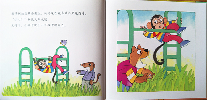 《狮子好捉弄》:小狮子第一天上学,喜欢偷偷地咬小伙伴的尾巴,把小伙伴欺负哭了,还嘴硬不承认,后来,大家想到一个办法,用绳子伪装成尾巴,小狮子张口就咬,被缠住了嘴巴,最后小狮子明白了乱咬别人的尾巴是不礼貌的。
