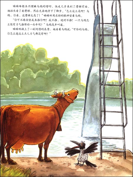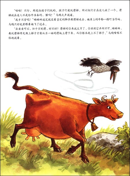 这个童话的主人公是一头有点不同寻常的小牛,她看到了牛圈外的世界,而且勇敢地走出去了。尽管她的好朋友乌鸦总是不断地提醒她:她只是一头牛,可她就是不相信人类小朋友能做的事情她却不可以做,难道就因为她是一头牛吗?乌鸦就像个墨守成规的成年人,而小牛却是个充满梦想的孩子。有趣的是,在小牛的影响下,乌鸦不知不觉地做了小牛的好帮手!