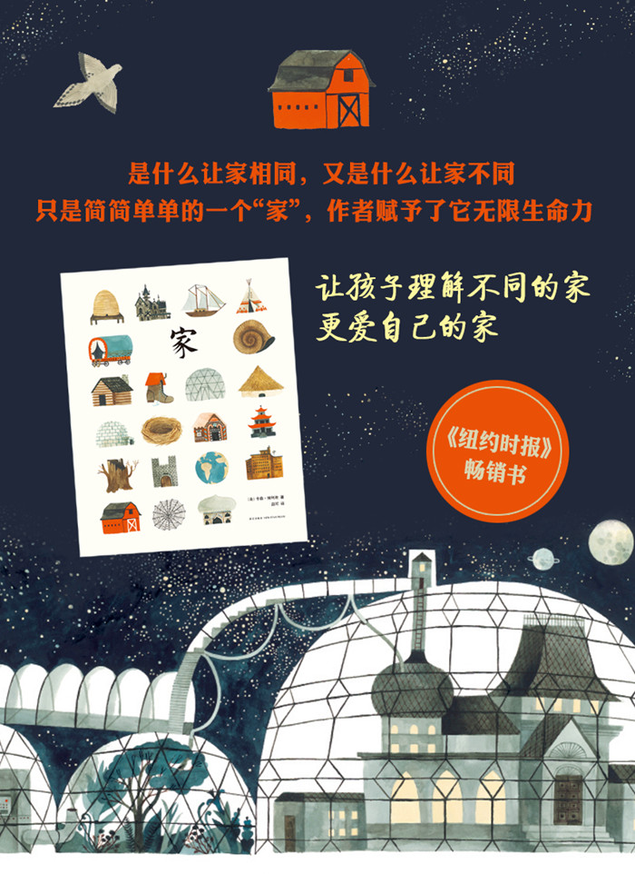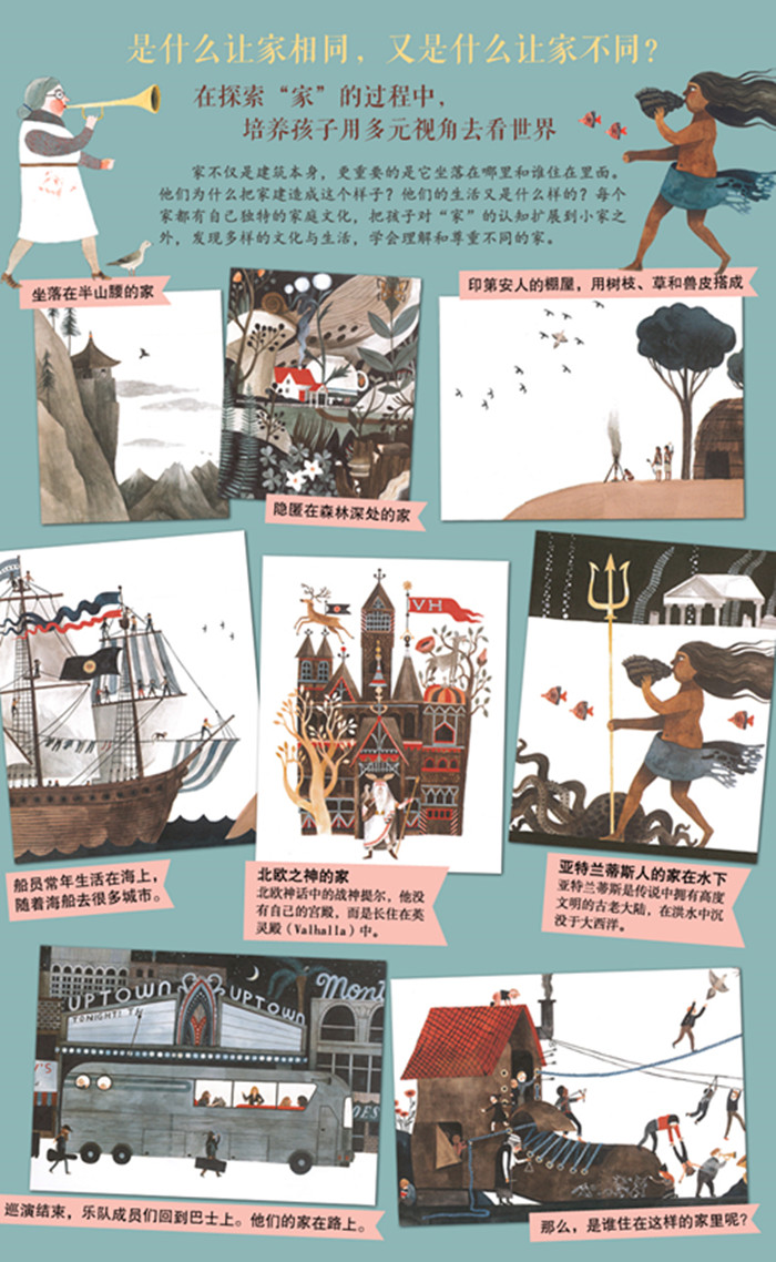 儿童图画书读物。乡间的房子,城市里的公寓,洞穴、宫殿、船,甚至是鞋子……它们都可以是家。那么,是谁住在这样的家里?铁匠、商人、艺术家、月球人……他们的家又是什么样子?你呢,你的家在哪儿?又是什么样的?只是简简单单的一个家字,作者赋予了它无限的生命力。在美妙的蓝灰、褐和砖红色的调色板下,作者卡森别具一格地描绘了形态各异的”家”,从最熟悉的乡间小屋到亚特兰蒂斯的水下世界再到遥远的外太空,让孩子理解不同的家,更爱自己的家。