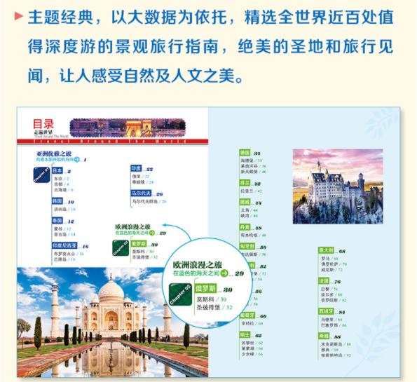 (1)主题经典,以大数据为依托,精选全世界近百处值得深度游的景观旅行指南,绝美的圣地和旅行见闻,让人感受自然及人文之美。