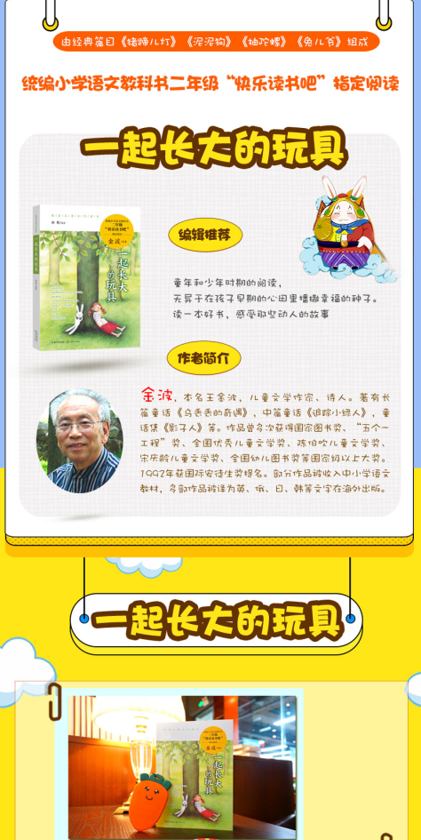 二年级下册语文教材“快乐读书吧”指定阅读,含《七色花》《一起长大的玩具》《大头儿子和小头爸爸》《愿望的实现》《神笔马良》。编排疏朗,赏心悦目,装帧精美,用纸考究适合二年级阅读和朗诵。