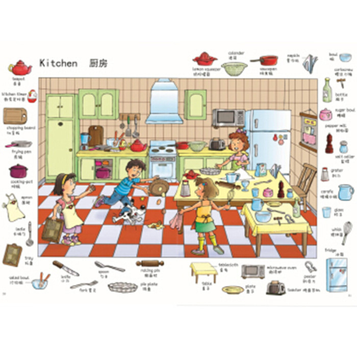 不同于普通图解词典一个单词对应一张图片,它是用场景带出单词,并附带一词一图,用浸入式情景有效激发左右脑联动记忆,更适合宝宝使用。