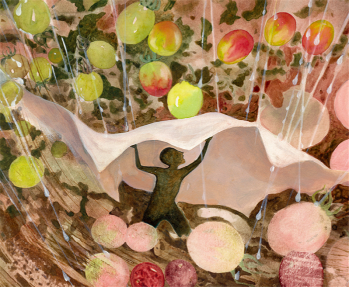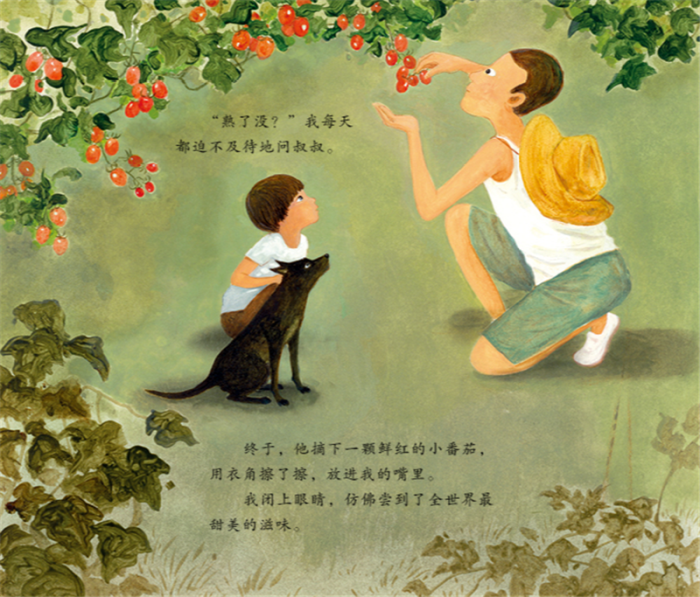绘者用大片色彩和象征手法描绘,书中不断出现的纹白蝶也暗示着主角破茧而出的蜕变,许多页面用大红色作为背景,不仅呈现出小番茄如红宝石般饱满的色彩和甜美的滋味,更赞美了浪子回头的努力和毅力。这些都让故事多了一份人文与艺术的氛围。