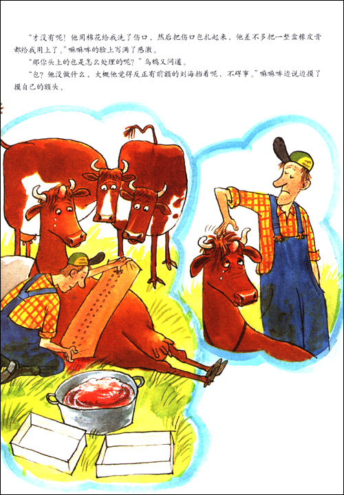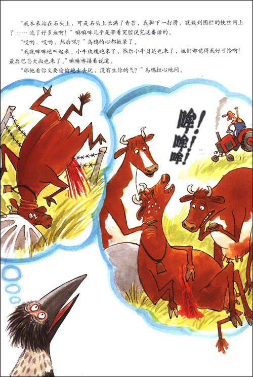 这个童话的主人公是一头有点不同寻常的小牛,她看到了牛圈外的世界,而且勇敢地走出去了。尽管她的好朋友乌鸦总是不断地提醒她:她只是一头牛,可她就是不相信人类小朋友能做的事情她却不可以做,难道就因为她是一头牛吗?乌鸦就像个墨守成规的成年人,而小牛却是个充满梦想的孩子。有趣的是,在小牛的影响下,乌鸦不知不觉地做了小牛的好帮手!