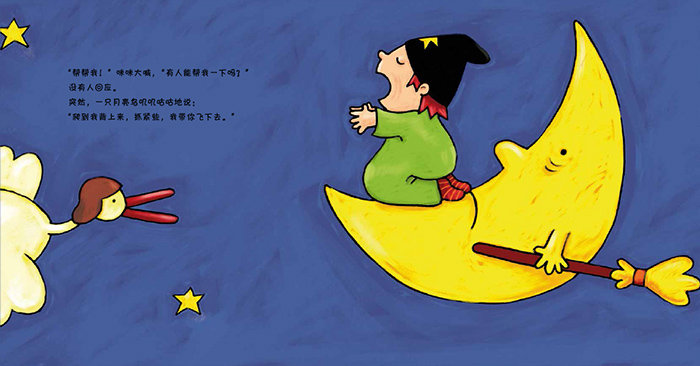 今天,小魔女咪咪想要飞到月亮上去玩儿。月亮上非常冷,幸好月亮戴着暖和的帽子。趁月亮睡着的时候,咪咪想偷戴一会儿月亮的帖子,但是,一不小心,帽子掉了下去……