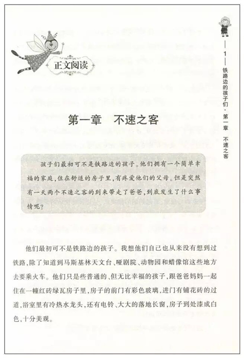 最开始,他们并不是铁路边的孩子。我想,他们只知道坐火车可以去天文台、剧院、动物园和杜莎夫人蜡像馆。他们只是普普通通的城郊孩子,和爸爸妈妈一起住在一幢普普通通的红砖房子里。这幢房子有带彩色玻璃的大门,铺着瓷砖的过道,可以流出冷水和热水的浴室,还有电铃、落地窗和大片粉刷得干净洁白的墙壁,以及,用房地产中介的话说——“一应俱全的现代化设施”。家里一共有三个孩子。罗伯塔是最大的。当然了,妈妈不应该偏爱哪个孩子,但如果她有一个最偏爱的,那大概就是罗伯塔了。老二是彼得,他希望自己长大以后能做一个工程师。最小的叫菲莉丝,她常常容易好心办坏事。他们的妈妈不会把自己的时间用来无聊地拜访无聊的太太们,也不会无聊地坐在家里等无聊的太太们来拜访。她几乎总是在家,陪孩子们玩游戏,给他们读书,辅导他们做作业。他们去上学的时候,她经常会为他们写故事,喝过下午茶就大声读给他们听。她也会经常写一些很好玩的诗,来庆祝他们的生日或其他重要的事情,比如说为新出生的小猫洗礼,重新装修洋娃娃屋,或是他们的腮腺炎痊愈。这三个幸运的孩子拥有他们所需要的一切:漂亮的衣服,温暖的炉火,可爱的、塞满了玩具的育儿室和画着《鹅妈妈童谣》故事的墙纸。他们有一位善良快乐的保姆,一条完全属于他们自己的名叫詹姆斯的小狗。他们还有一位十全十美的好爸爸。他从不发脾气,从不偏心,总是准备好和他们一起玩游戏——至少,如果他没准备好,他也总有一个十分合理的理由,并且会用非常有趣的方式对孩子们解释,让他们相信他确实是不得已。你一定觉得他们应该非常幸福吧。他们的确非常幸福。但是直到住在红砖房里的幸福生活彻底结束,他们过上了完全不同的生活时,他们才知道自己曾是多么幸福。这可怕的变化来得非常突然。彼得已经过了他第十个生日。在他得到的礼物中,有一个漂亮得超乎你想象的小火车。他的其他礼物也很棒,但这辆小火车比那些礼物都更富有魅力。小火车的魅力完完好好地维持了三天。可是在这之后,也许是因为彼得经验不足,也许是因为菲莉丝好心办了坏事,又或许是因为其他什么原因,小火车突然砰的一声爆炸了。小狗詹姆斯吓坏了,跑到外面一整天不敢进来。放在火车里的诺亚方舟玩具小人都变成了碎片。不过别的什么都没受到伤害,受伤的只有可怜的小火车和彼得的感情。另外两个孩子说彼得为了小火车哭了,不过,不管发生了多么可怕的悲剧,一个十岁的男孩都是不会哭的——彼得说自己只是因为感冒眼睛才变红的。不过他这么说的时候,还不知道这句话即将变成现实。第二天,他就不得不一直躺在床上了。妈妈开始担心他是不是得了麻疹,这时他突然从床上坐起来说:“我讨厌粥,我讨厌大麦汤,我讨厌面包和牛奶。我想起来吃一顿真正的饭。”“你想吃什么?”妈妈问。“鸽子馅饼。”彼得渴望地说,“一个大大的鸽子馅饼,非常大的。”于是妈妈告诉厨师做了一个很大的鸽子馅饼。馅饼做好了,彼得吃了一点儿,然后他的感冒就好多了。馅饼还在做着的时候,为了让彼得打起精神来,妈妈写了一首诗。这首诗首先描写了彼得是一个多么可怜而又多么可敬的小男孩,接着这样写道:他有一辆小火车,他爱如珍宝;如果他可以许愿,一定希望它保持完好。有一天啊——我的朋友,请做好最坏的准备——一颗螺丝突然发疯,锅炉爆炸了。他悲伤地捡起小火车交给妈妈,不过他知道她也没办法把它修好。那些死去的玩具小人他可不管,他的小火车比它们都来得更重要。现在你知道我们的彼得为什么会生病了吧,他需要用鸽子馅饼来抚平他的伤痛。他裹着温暖的毛毯睡到很晚,决心用这种方法来战胜悲惨的命运。如果他眼睛泛红,感冒是个很好的理由。递给他一个馅饼,他绝对不会不吃。爸爸离开家已经三四天了。现在,彼得把修好可怜的小火车的希望都寄托在了他身上。因为爸爸的手非常灵巧,他能修好各种东西。他常常去做摇摆木马的“兽医”。有一次,所有的救助手段都不起作用了,这个可怜的小家伙已经没有希望了,就连木匠也说自己无能为力,最后就是爸爸拯救了它的生命。也是爸爸修好了别人都修不好的洋娃娃的摇篮。他还用一点儿胶水、一些碎木头和一把铅笔刀,把诺亚方舟上所有的动物都牢牢地固定在了它们的位置上,甚至比以前还要牢固。现在,爸爸回来了。彼得带着一种英雄般的无私精神,没有马上跟爸爸说小火车的事,而是一直等到爸爸吃完晚饭,吸完饭后的雪茄。彼得这么做是妈妈提出来的,可执行的人是他自己,而且这个主意执行起来还需要很多很多的耐心呢。终于,妈妈对爸爸说:“好了,亲爱的,如果你休息好了,感觉舒服了,我们想告诉你一起严重的‘铁路事故’,想听听你的意见。”“好的,”爸爸说,“尽管说吧。”于是彼得讲了那个悲惨的故事,还拿来了小火车的残骸。“嗯。”爸爸认真仔细地检查着小火车。孩子们都紧张地屏住了呼吸。“还有希望吗?”彼得用颤抖的声音低低地问。“希望?不止呢!我们有很大的希望啊。”爸爸欢快地说,“但除了希望之外,我们还需要一些其他的东西,比如一些铜焊工具,一点儿焊接材料,还有一个新阀门。我觉得,我们最好把这工作留到一个下雨天,换句话说,我准备用星期六的下午。你们都来帮忙吧。”“女孩能