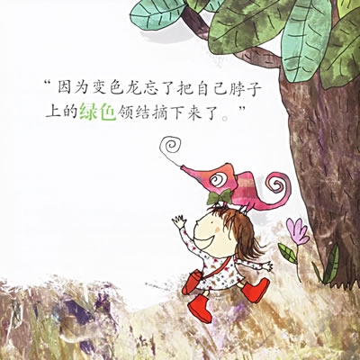 这是幼儿认知双语绘本中的一本,原来一直没给佳看过。故事,讲的是封面的这个小女孩,有一个变色龙。有一天呢,她一不小心摔了一跤,变色龙跑了,变成黄色的躲在香蕉里,找找看吧,变色龙在哪里呢?