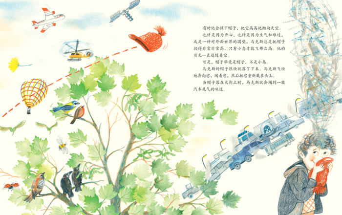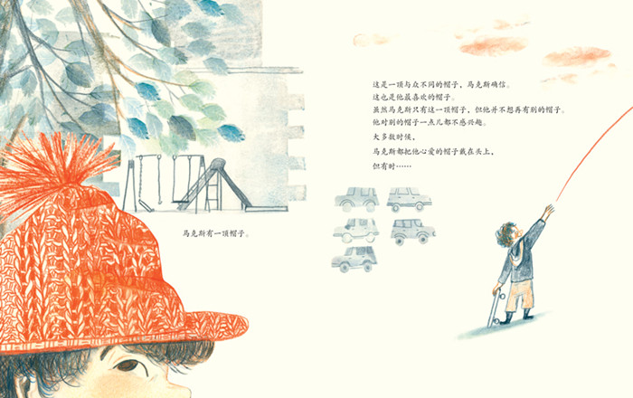 1.图画书从儿童心理特点出发构思情节,展开了小马克斯的帽子经历的系列冒险。帽子是小主人公重要的玩伴和情感寄托,随着帽子一次次被抛向空中,小主人公在想象中走出了眼前的狭窄空间,去到了不曾去过的远方,看到了色彩斑斓的大世界;