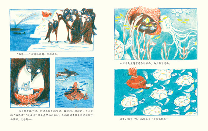 2.图画书中的帽子具有激发小主人公想象和冒险天性的魔法,帽子的经历既夸张离奇,又自成逻辑,符合儿童天性;