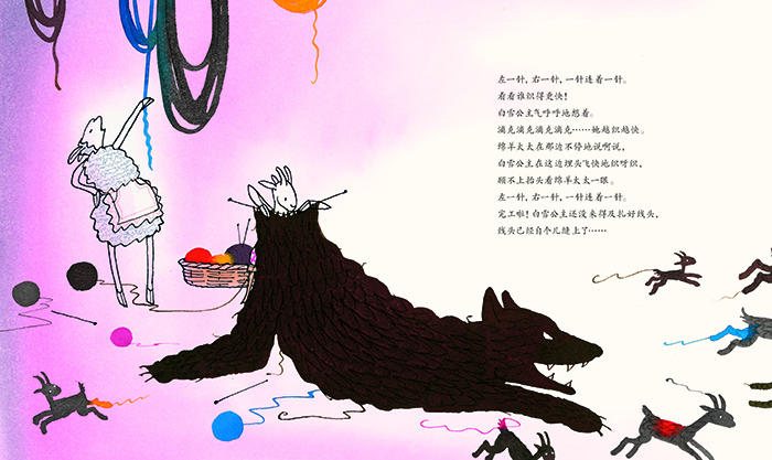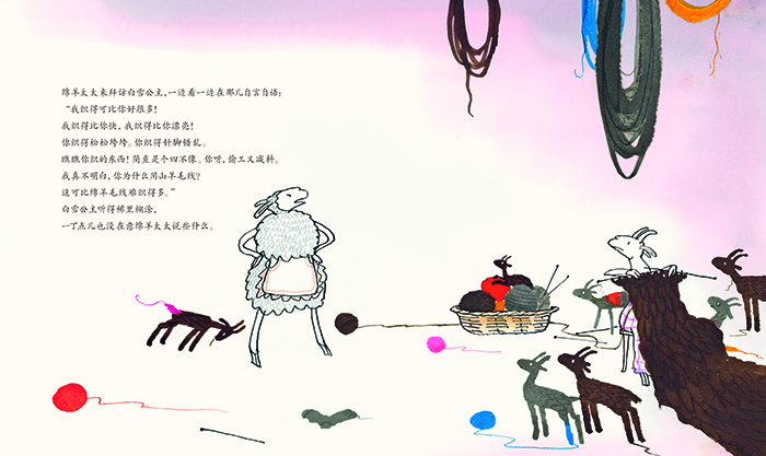 白雪公主喜欢织袜子,她给大家织了很多羊毛袜。今天,白雪公主想织点别的,织点和羊毛袜不一样的东西。她织了一整只山羊!绵羊太太来拜访。一只大灰狼从毛衣针上跳了下来!他啊呜一口吞下了绵羊太太。白雪公主织了一只老虎来战胜大灰狼,可是惊险并未平息。面对凶险的老虎,白雪公主再次用智慧化险为夷,她织了一个怪物,一个她能控制的怪物.....画家的色彩调制,清晰有力地渲染出了人物的内心。