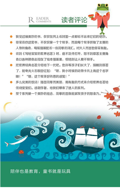 ·**的创作题材 0-3 岁宝宝读世界名著,可谓是闻所未闻的。迄今为止,该书系在世界范围可以说是**,堪称童书出版的奇葩。有世界经典名著背书,该纸板书定能有着更长久的生命力。