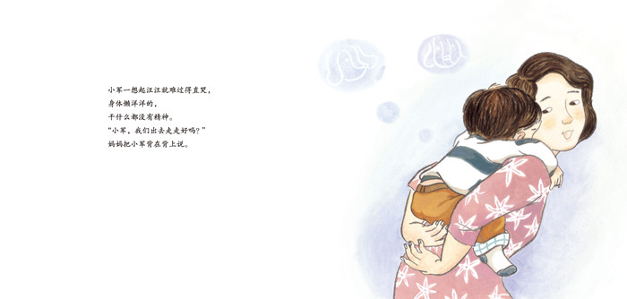 小军有一个好朋友,一只玩具熊汪汪。小军不管到哪都要带着汪汪。可是有一次,他睡着了,把汪汪忘在了火车上。小军很悲伤,总是提不起精神。妈妈背着小军去看蓝蓝的天,白白的云朵,五彩的花儿,美丽的蝴蝶……妈妈说,汪汪去旅行了,它会遇见另一个爱它的主人……