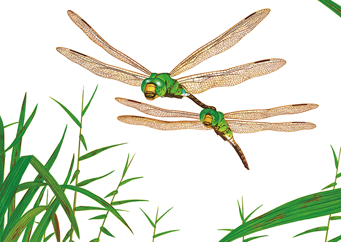在水中生活的“水虿”羽化为成虫的雄碧伟蜓,展开美丽的翅膀,在原野和森林自由飞舞。不久,为了孕育新生命,它们重返水边,一边来回巡视,一边等待雌碧伟蜓的到来。雌雄碧伟蜓相遇不久,就会在水边的水草里孕育新生命。