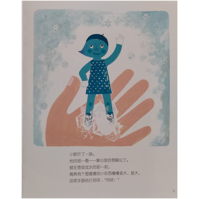 一个下雪的早上,小欧兴奋地跑到门外用手掌迎接飘落的雪花。突然从他的掌心传来叫喊声,有个湿漉漉的小东西竟然慢慢变大。