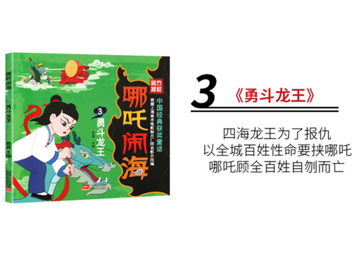 《哪吒闹海》含5册:《哪吒出世》《大战龙太子》《勇斗龙王》《莲花化身》《大闹龙宫》,讲述了陈塘关李靖之子哪吒与东海龙宫之间的恩怨情仇,塑造了一个顶天立地的民族小英雄的形象。家长和孩子通过阅读纸上动画片,可以一起重温儿时的经典,感受民族文化的魅力,领悟做事做事的道理。