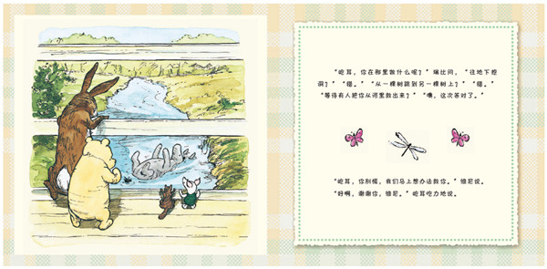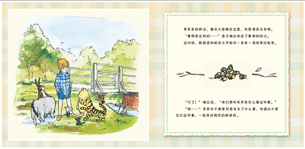 《维尼的新游戏》是一个教小朋友学会“互相理解”的故事:小熊维尼发明了一个新游戏!他和小伙伴们都很喜欢玩这个游戏,可是在玩游戏时,他们发现屹耳竟然掉到了河里!他们齐心协力救出了屹耳,然后又开心地玩起了新游戏。