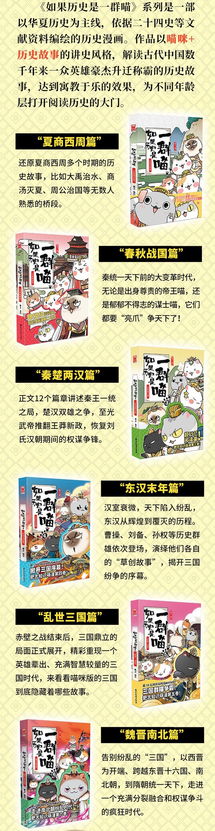 《如果历史是一群喵5·乱世三国篇》是漫画家肥志编绘的历史漫画系列续作第五卷,承接第四卷“东汉末年篇”赤壁之战结束后,三国鼎立的局面正式展开。三国是中国历史上极受后人关注、永/不缺“流量热度”的英雄时代,也是中国历史上ZUI为精彩的乱世。肥志及他的团队将在本卷中,通过十二只喵咪把三国向你娓娓道来,还原一个个扑朔迷离的历史故事,告诉你三国为什么这么火!