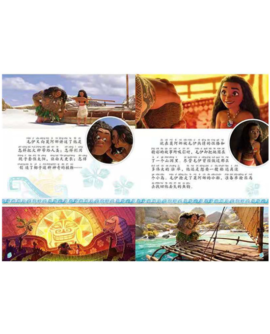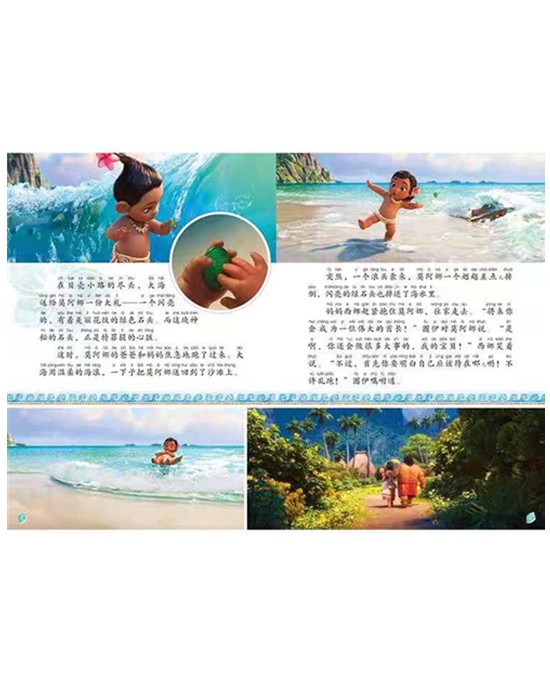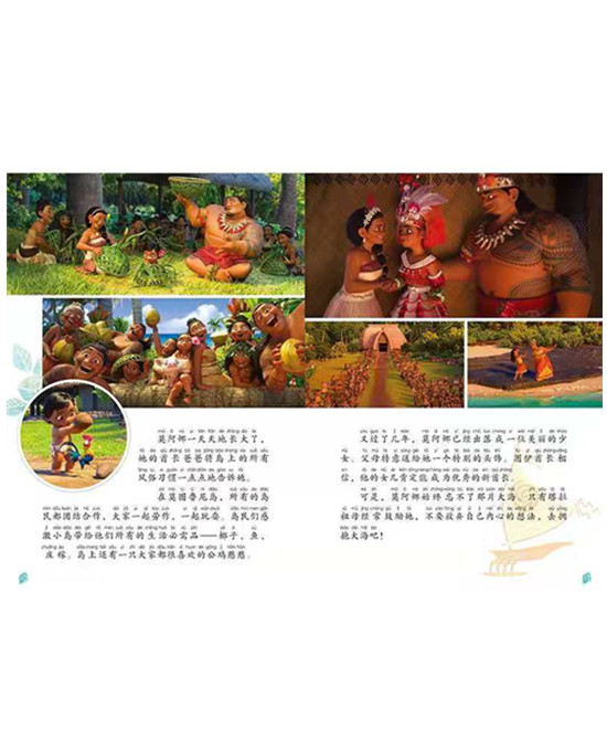 这是一本图画故事书,加注拼音。在蓝色的大洋中间有一座美丽的莫图鲁尼岛,岛上的居民世代在那里生息繁衍。主人公莫阿娜是部落首领的女儿,她受到祖母的鼓励一心想去大海,来解决部落的危机,但是因为父亲的阻碍和文化的禁忌,莫阿娜始终没有踏出一步。但有一天莫阿娜还是选择挣脱束缚,独自踏上了旅途。途中,她碰到了了半人半神的毛伊,于是二人共同前往广袤的海洋,开启了一场冒险之旅。