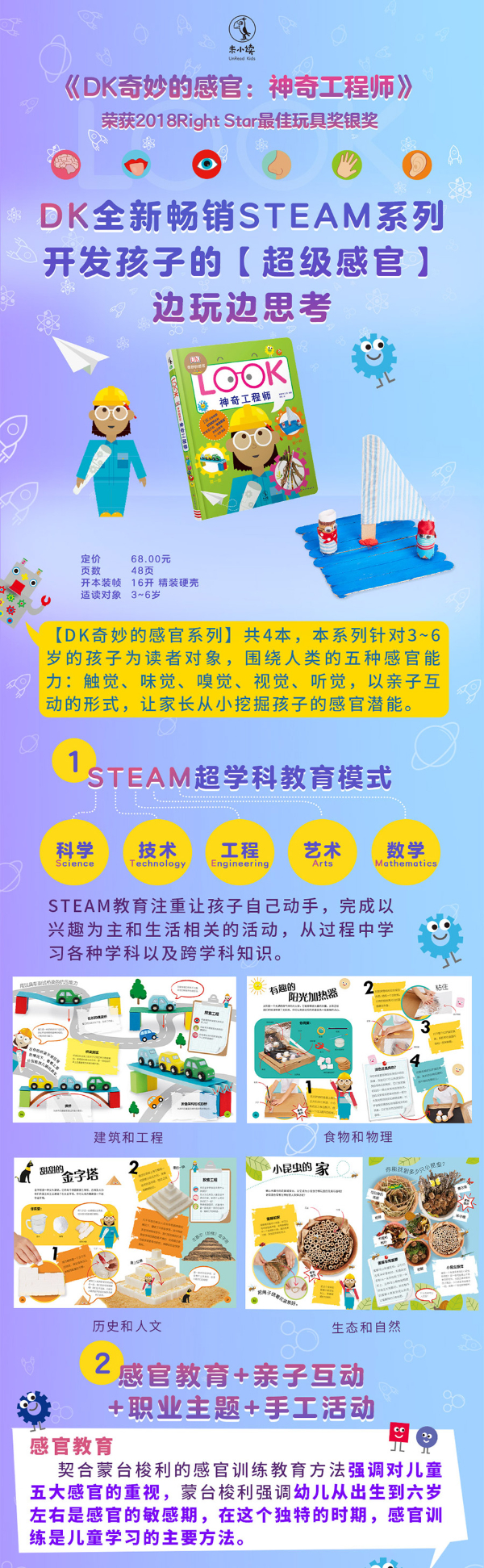 ★STEAM超学科教育模式。 探究式学习方法:基于现实问题,提出自己的思路; 重视学习过程而非结果; 物理 化学 生物反应; 食物 艺术、食物 科学。 ★契合蒙台梭利的感官训练教育方法相。 强调对儿童五大感官的重视; 蒙台梭利强调幼儿从出生到六岁左右是感官的敏感期,在这个独特的时期,感官训练是儿童学习的主要方法。 ★感官教育 亲子互动 职业主题的学龄前儿童活动书。 为孩子未来的语言、书写、思维和生活能力打下基础。 ★体系完整的亲子互动感官教育类书系。 厨师 科学家 工程师。 ★活动和实验极具游戏力。 孩子喜爱的场景化活动,每个活动是一个游戏,符合孩子年龄特点。 ★高清照片展示步骤清晰,材料随手可得。 步骤照片 简洁的文字解说; 食材和工具都是日常可见在; 操作步骤简单,过程有趣味性。 ★DK童书的强大口碑和市场号召力。