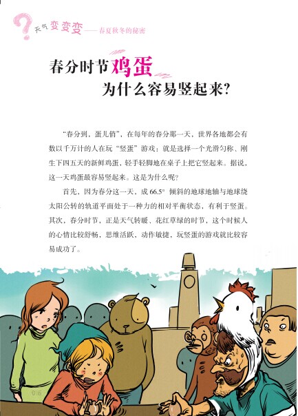 “春分到,蛋儿俏”,在每年的春分那一天,世 界各地都会有 数以千万计的人在玩“竖蛋”游戏:就是选择一个光 滑匀称、刚 生下四五天的新鲜鸡蛋,轻手轻脚地在桌子上把它竖 起来。据说, 这一天鸡蛋最容易竖起来。这是为什么呢? 首先,因为春分这一天,成66.5°倾斜的地球 地轴与地球绕 太阳公转的轨道平面处于一种力的相对平衡状态,有 利于竖蛋。