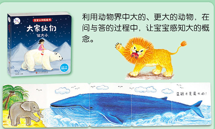 《宝宝认知纸板书(套装全4册)》共包括《猜猜这是谁》《你好,你是谁》《大家伙们》《小家伙们》四册绘本,包含认知形状、观察局部与整体、比较大小等内容。涉及翻翻、洞洞、立体、超长拉页等多重展现形式,以各种动物为主角,通过简单的问答和儿歌,让孩子在翻翻与寻找的亲子互动过程中发现答案,获得知识与快乐。