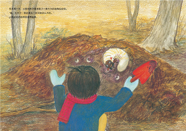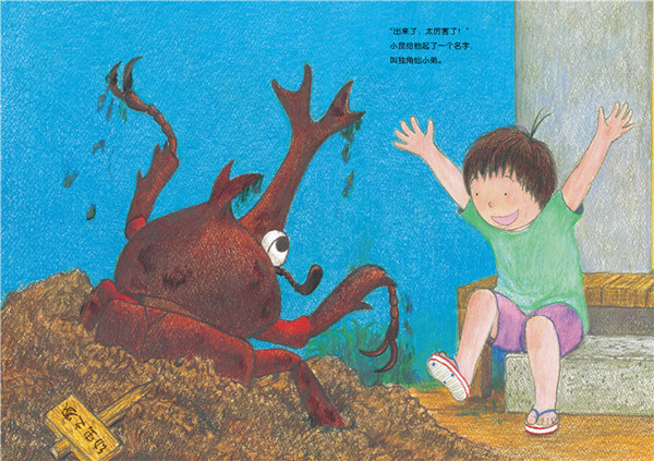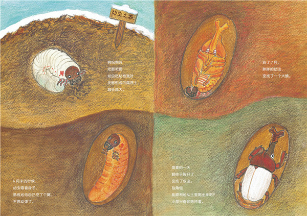 (1)昆虫绘本家多田智真情表达儿时与昆虫相伴的记忆。他小时候特别想要一只大大的独角仙做朋友,想救一只卡在洞里的吉丁虫,这些愿望都在故事里一一实现