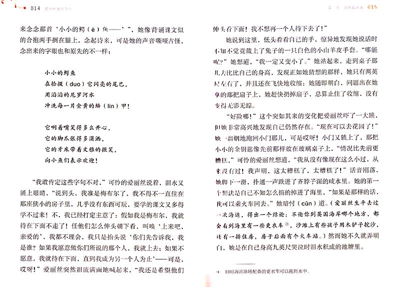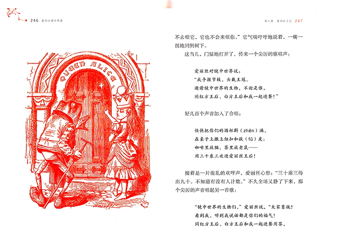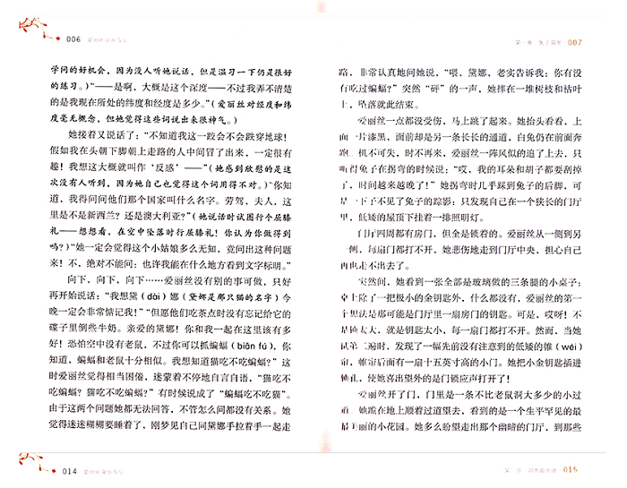 《爱丽丝漫游奇境》一书讲述了小姑娘爱丽丝追赶一只揣着怀表、会说话的白兔,掉进了一个兔子洞,由此坠入了神奇的地下世界的故事。在这个世界里,喝一口水就能缩得如同老鼠大小,吃一块蛋糕又会变成巨人,在这个世界里,似乎所有吃的东西都有古怪……在这个奇幻疯狂的世界里,似乎只有爱丽丝是头脑清醒的人,她不断探险,同时又不断追问“我是谁”,在探险的同时不断认识自我,不断成长,终于成长为一个“大”姑娘的时候,猛然惊醒,才发现原来这一切都是自己的一个梦境。