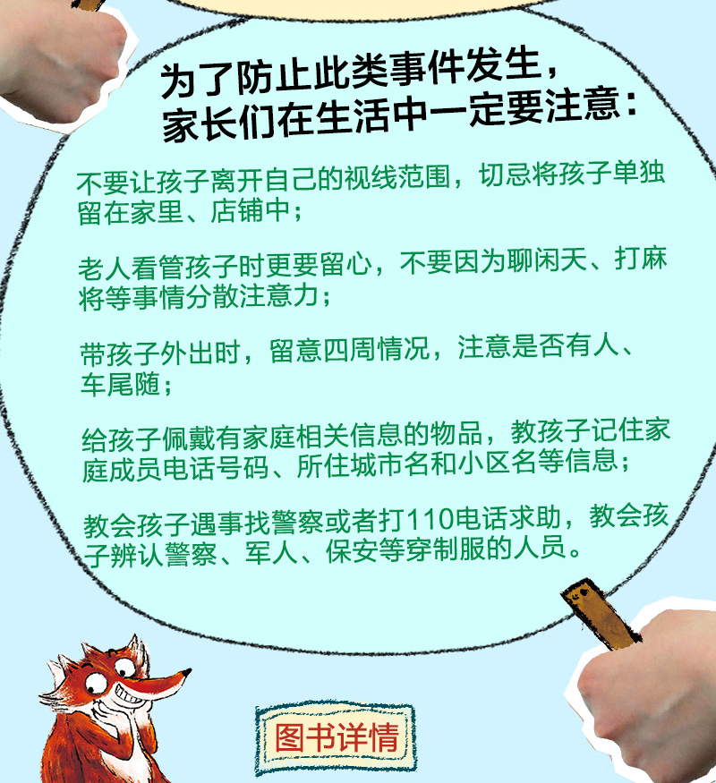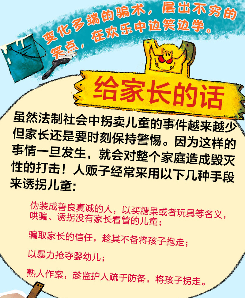 虽然法治社会中拐卖儿童的事件越来越少,但家长还是要时刻保持警惕。因为这样的事一旦发生,就会对整个家庭造成毁灭性的伤害!这本书从人贩子的角度,介绍了多种拐卖儿童的常用手段,其中更加入了与小读者互动的环节,由读者照看小宝宝,直接对抗人贩子。这种独特的叙事手法可以带来更强的参与感和更好的阅读体验,同时还能让家长与孩子更快地树立起防拐意识,学会分辨坏人,从而避免拐卖事件的发生。